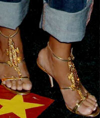 flache Sandalen trage und mich zu Hause entspanne. Ich ziehe meine flachen Sandalen nie aus. Seitdem ich in Hollywood lebe, trage ich immer Sandalen". Auf dem Foto: Mit Tieren (Skorpion, goldene Fische und ein Kristallkrokodil) geschmückte Sandalen von